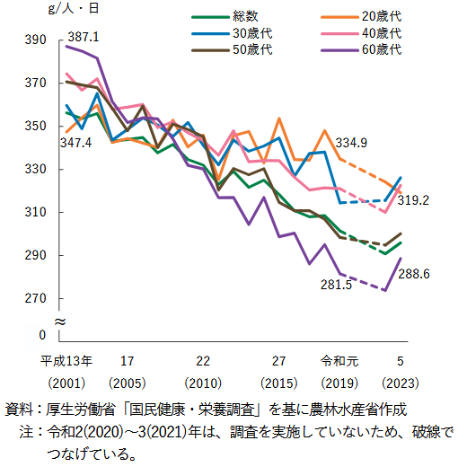 農業経営の多角化が求められる背景には、消費者のライフスタイルの変化もあります。「令和6年度 食料・農業・農村白書(農業白書2024)」によると、米・米加工品の1人1日当たり摂取量は減少傾向にあります。特に興味深いのは、若年層だけでなく、50歳代や60歳代の高齢層において米の消費が急減している点です(60歳代では平成13年比で25.4%減)。食の多様化や簡便化、炭水化物の摂取を控える健康志向の広がりが、主食用米の需要を押し下げている現状があります。