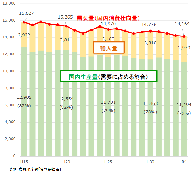 国内の野菜需要量は、人口減少や食の少食化等を背景に、過去約20年間で1割減少しました(平成15年の15,827千トンから、令和4年には14,164千トンへ)。供給の内訳を見ると、国内生産量が全体の約79%(11,194千トン)を占め、残りの約21%(2,970千トン)を輸入に依存している状況です。